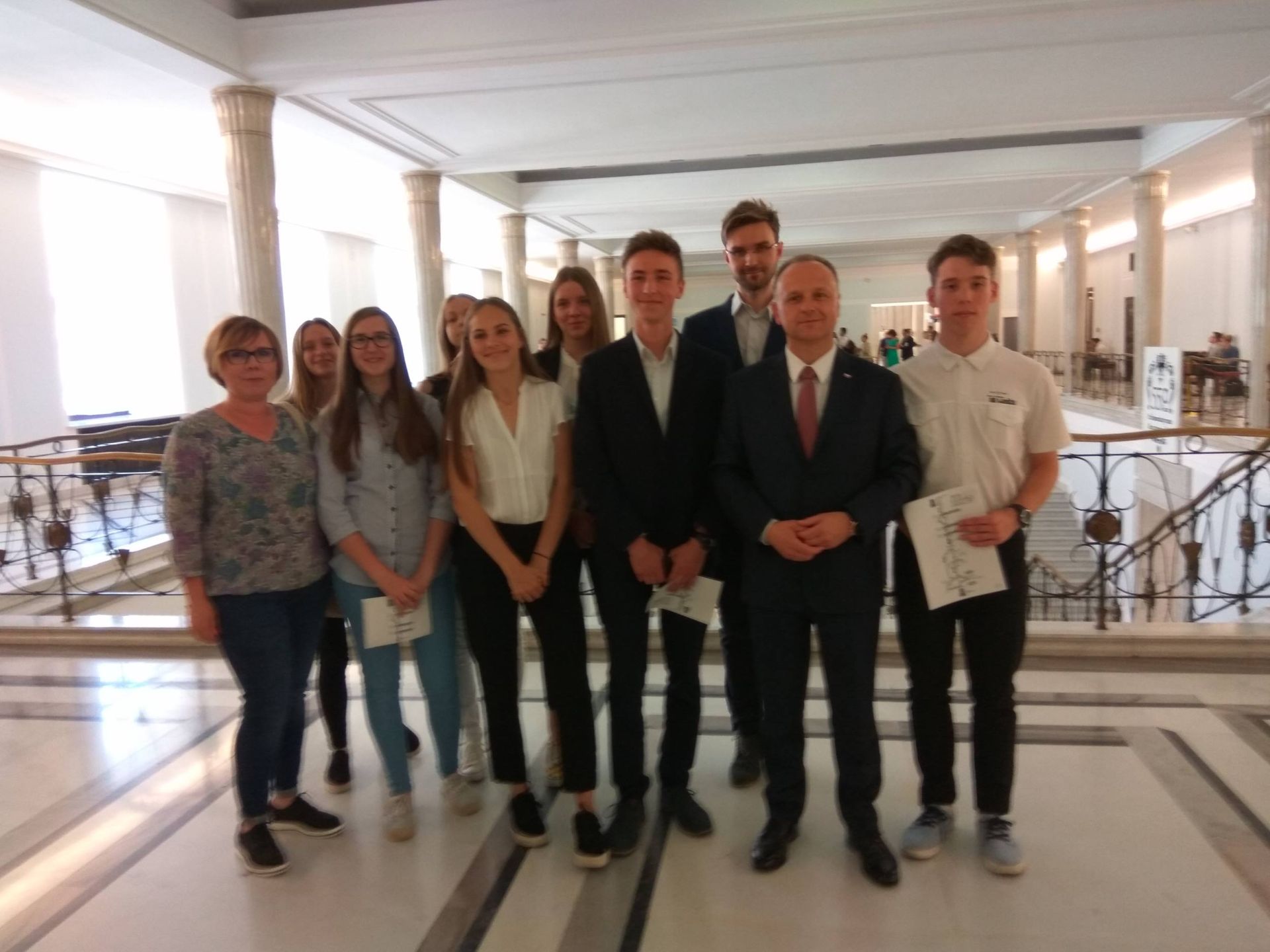 Dzisiaj na zaproszenie Posła RP Dariusza Starzyckiego w Sejmie gościli uczniowie oraz nauczyciele naszego Zespołu Szkół Ogólnokształcących wraz z dyrektorem Panią Martą Figurą. Wyjazd został zorganizowany w związku z wygraną Szymona Łuszcza z klasy IIb w zorganizowanym przez pana Posła konkursie pn. „100 lat Niepodległej”.