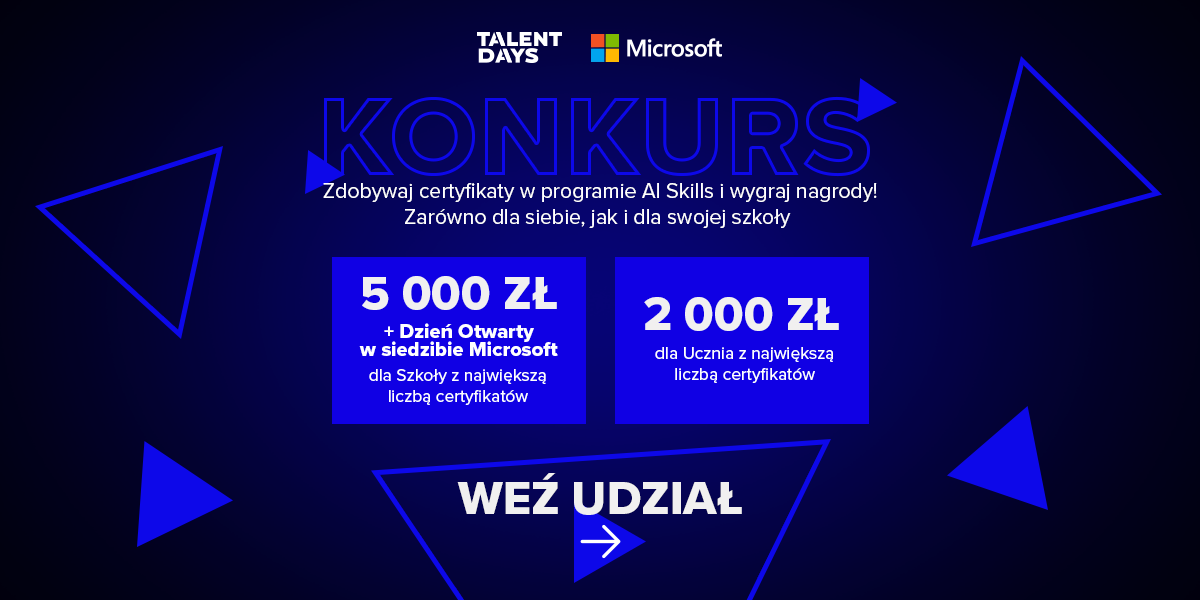 Zapraszamy udziału w konkursie edukacyjnym, który jest organizowany w ramach II edycji programu „AI Skills Today, Career Tomorrow”, realizowanego we współpracy z Microsoft. To konkurs skierowany do szkół ponadpodstawowych, łączący rozwój kompetencji uczniów z atrakcyjnymi nagrodami dla placówki i najaktywniejszego ucznia.
