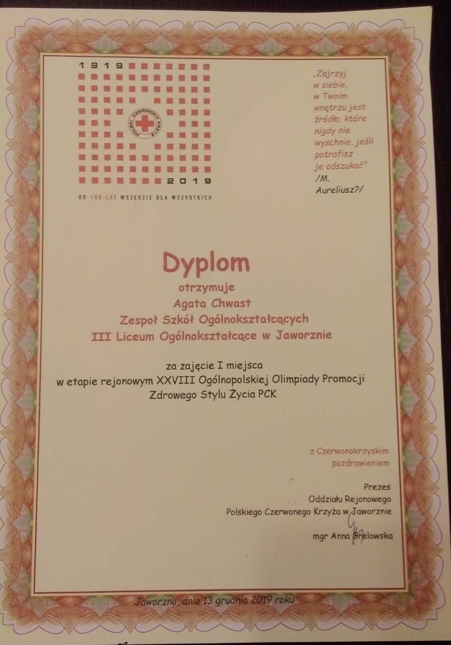 13 grudnia br. odbył się etap rejonowy XXVIII Ogólnopolskiej Olimpiady Promocji Zdrowego Stylu Życia PCK organizowany przez Śląski Oddział Okręgowy PCK. Konkurs wygrała uczennica klasy IIIa naszego liceum Agata Chwast. Zajęcie I miejsca dało Agacie mandat do reprezentowania nas i miasto w etapie okręgowym. Agacie i jej opiekunce p. Dorocie Szczyrzycy serdecznie gratulujemy sukcesu i już dziś trzymamy kciuki za kolejne zwycięstwo.