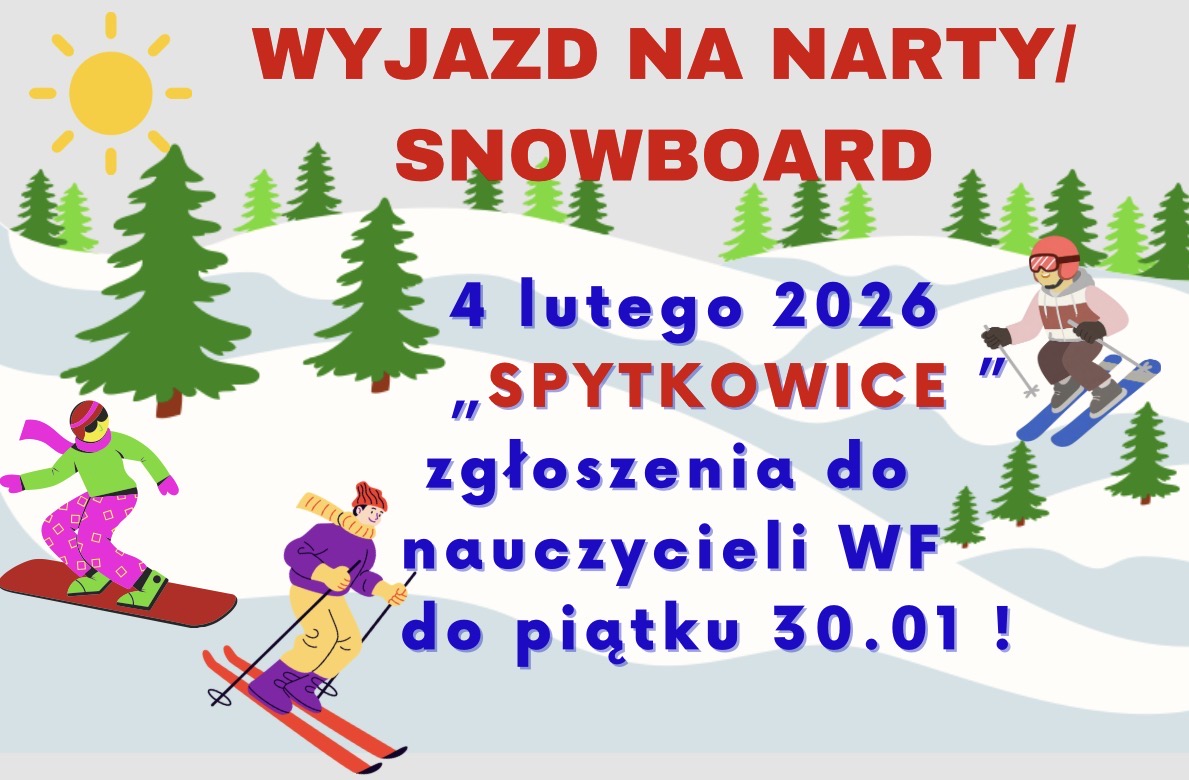 Szkolny wyjazd na narty i snowboard odbędzie się 4 lutego! Jedziemy do ośrodka Beskid – Spytkowice. Zapisy u nauczycieli wychowania fizycznego.